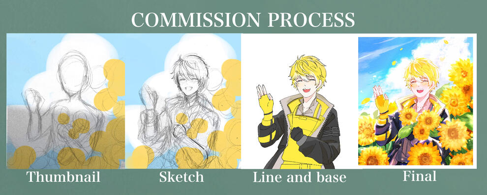 -First, I will need as many references related to the painting as possible (drawings, description, or photos,... In case you already have a clear idea of the painting, a simple thumbnail sketch would help!) so that I can understand the kind of atmosphere you expect.-After gathering references, I will give you 2-3 thumbnail sketches, you can pick the one that best expresses your idea.After this stage, you have to pay me 100% in advance, so that I can start to work on your commission.